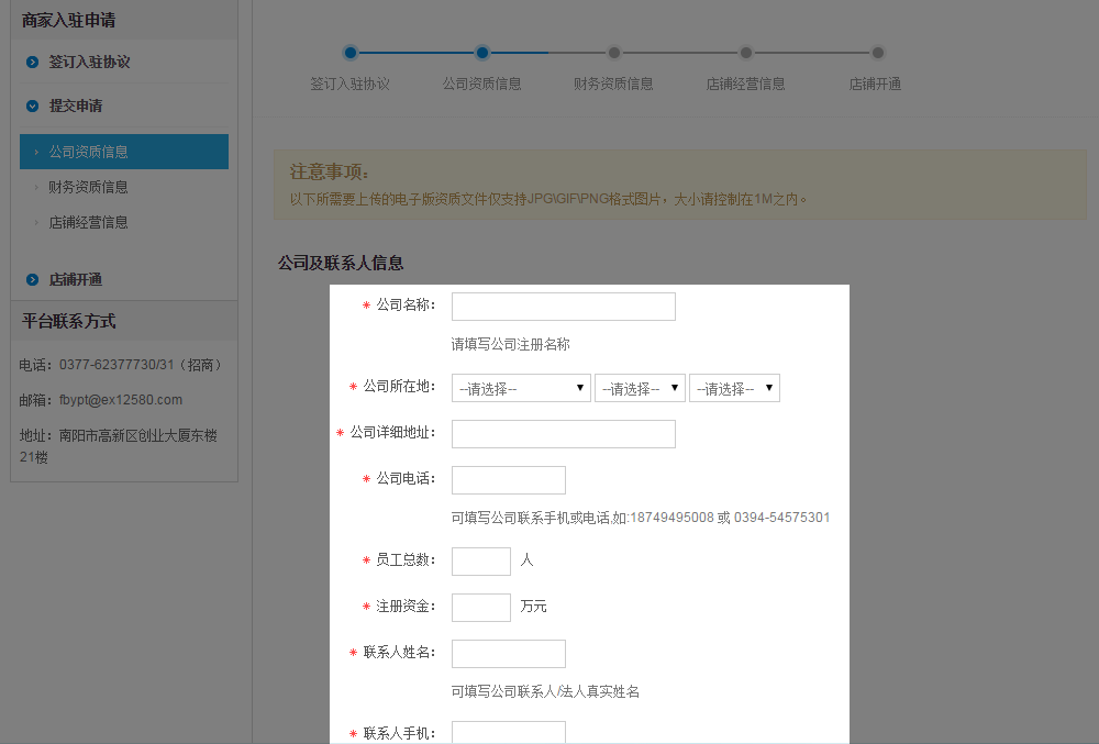 5、進(jìn)入商家資質(zhì)信息提交步驟,填寫(xiě)公司及聯(lián)系人信息,按提示填寫(xiě)公司基本信息及聯(lián)系人信息。