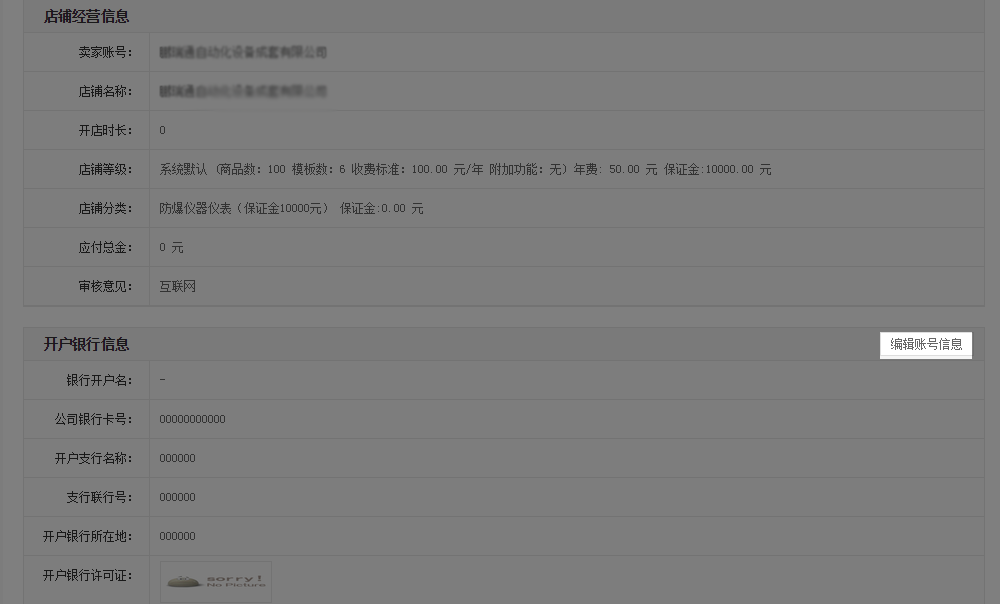 10、 店鋪經營信息為前期注冊時的資料,無法修改,點擊“編輯帳號信息“可以修改開戶銀行信息。